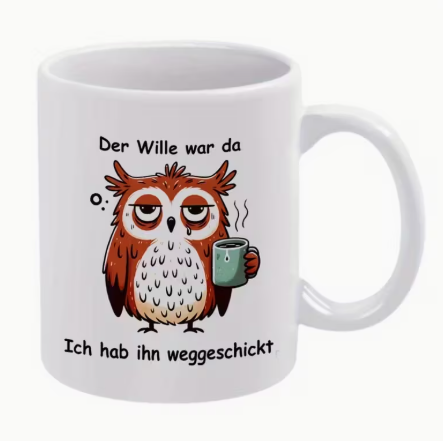 Neu und originalverpackt: Witzige Kaffeetasse aus Keramik, perfekt für Morgenmuffel! Die weisse Tasse zeigt eine müde Eule mit dem Spruch „Der Wille war da, ich hab ihn weggeschickt“. Ideal für den Kaffee am Morgen oder als Geschenk für Freunde mit Humor. Ein Hingucker auf jedem Frühstückstisch!