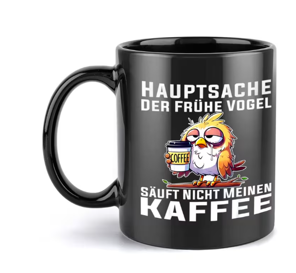 Neu und originalverpackt: Schwarze Kaffeetasse aus Keramik mit lustigem Vogel-Motiv „Hauptsache der frühe Vogel säuft nicht meinen Kaffee“. Perfekt für Morgenmuffel und Kaffeeliebhaber. Ein toller Hingucker im Büro oder zu Hause. Super Geschenkidee für alle, die Humor haben.