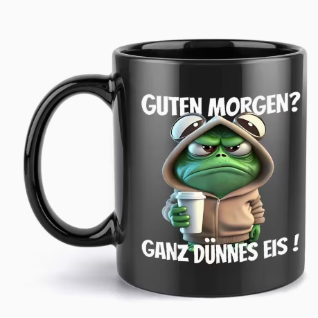 Neu und originalverpackt: Schwarze Kaffeetasse aus Keramik mit lustigem Frosch-Motiv – perfekt für Morgenmuffel! Ideal für kalte Wintertage, bringt diese Tasse mit ihrem ironischen Spruch („Guten Morgen? Ganz dünnes Eis!“) jeden zum Schmunzeln. Ein originelles Geschenk für Freunde und Familie! Jetzt zugreifen!